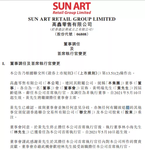 龙商网信息:5月10日晚,高鑫零售(06808.HK)发布董事调任及首席执行官变更公告,黄明端因届龄退休,辞任首席执行官。自2021年5月10日起,黄明端调任为非执行董事,任期至2024年5月9日,并继续担任董事会主席。
