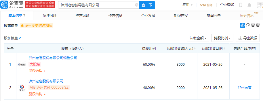龙商网消息:天眼查信息显示,5月26日,泸州老窖新零售有限公司成立,法定代表人为易彬,注册资本5000万元人民币,经营范围包含:食品互联网销售 ;食品经营;货物进出口;农副产品销售;水产品批发;水产品零售;建筑材料销售等。股权穿透图显示,该公司由泸州老窖股份有限公司销售公司、泸州老窖股份有限公司共同持股。值得一提的是,今年4月,泸州老窖定制酒有限公司上线京东、天猫旗舰店,并推出白酒线上定制功能。