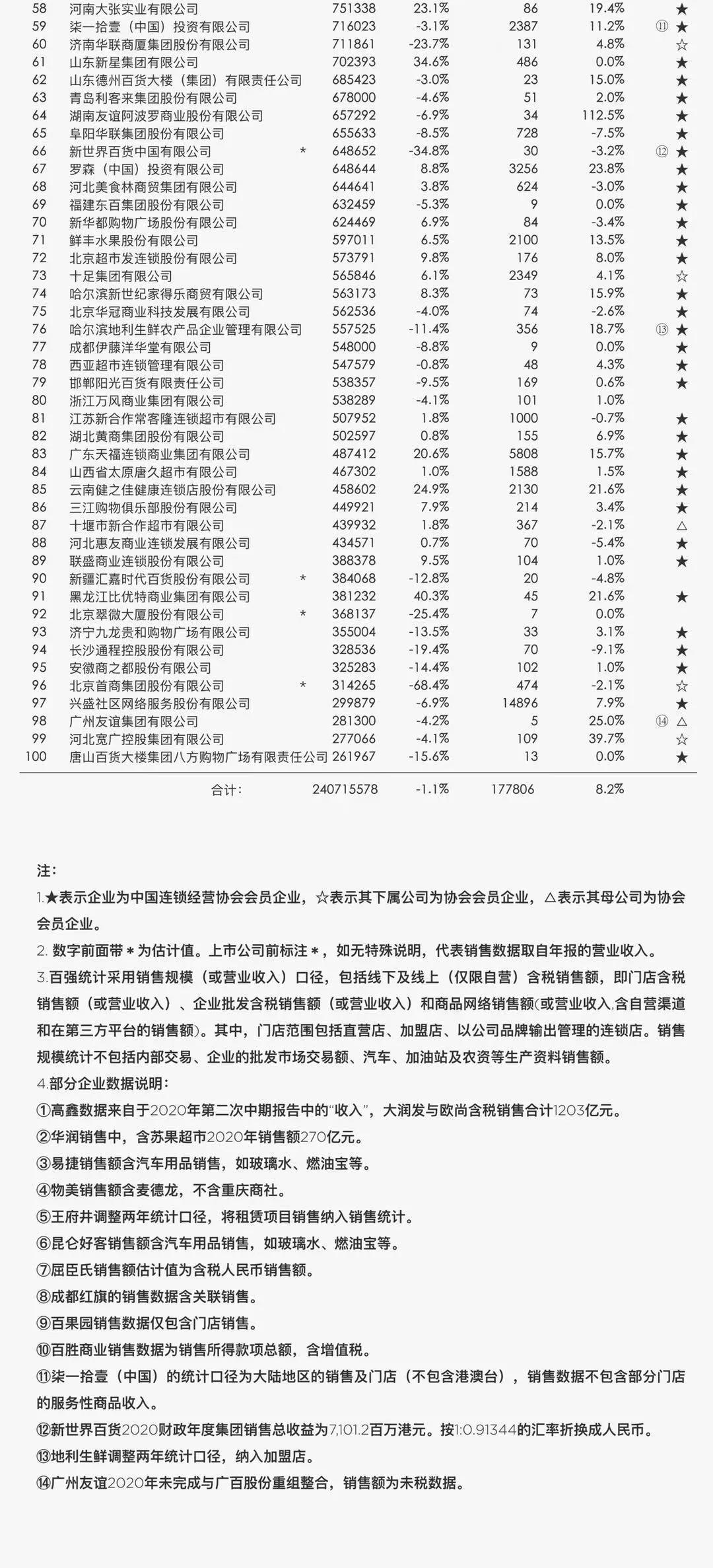 2020年中国连锁百强榜单出炉:物美杀入十强,行业整体销售首次负