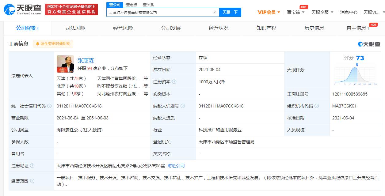 天眼查APP显示,近日,天津狗不理食品科技有限公司成立,注册资本1000万人民币,法定代表人为张彦森,经营范围含技术服务、技术开发;工程和技术研究和试验发展等。股东信息显示,该公司由狗不理集团股份有限公司全资持股。