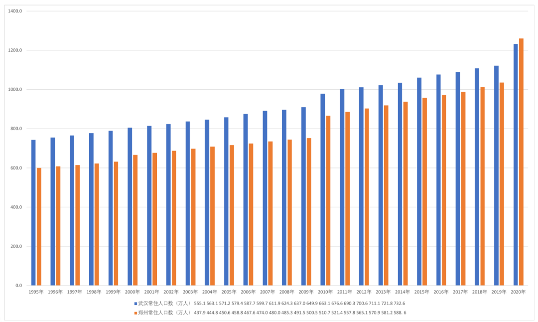 1978年至今武汉、郑州两地常住人口数(蓝色为武汉,橘色为郑州)