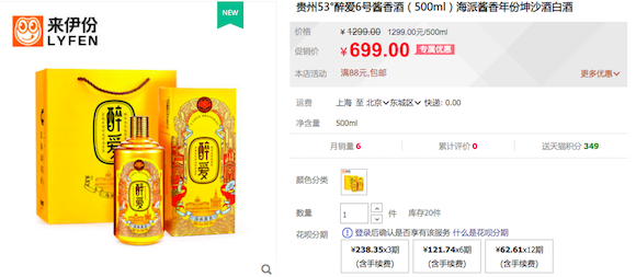 搜索来伊份天猫旗舰店可以看到,目前店内在售的白酒产品有两款,分别是贵州53°醉爱6号酱香酒和贵州53°醉爱红酱香酒,容量均为500ml,生产厂家是贵州省仁怀市茅台镇林河酒业有限公司。两款白酒的单瓶定价分别为1299元和1199元,现阶段的“新品尝鲜价”分别为699元、499瓶。