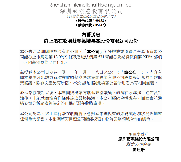 深圳国际在港交所发布公告称,与苏宁易购股东方未能就商务合作条件达成最终协议,经综合考虑各方面因素并通过审慎分析论证后决定终止进行潜在收购事项,但双方将继续探索物流业务领域合作的机会。