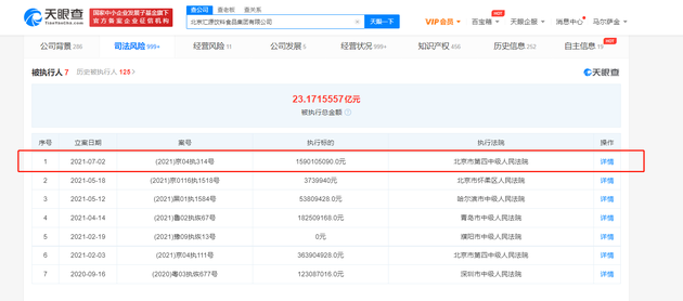 7月6日消息,天眼查App显示,北京汇源饮料食品集团有限公司新增一条被执行人信息,案号(2021)京04执314号,执行标的超15.9亿元,执行法院为北京市第四中级人民法院。