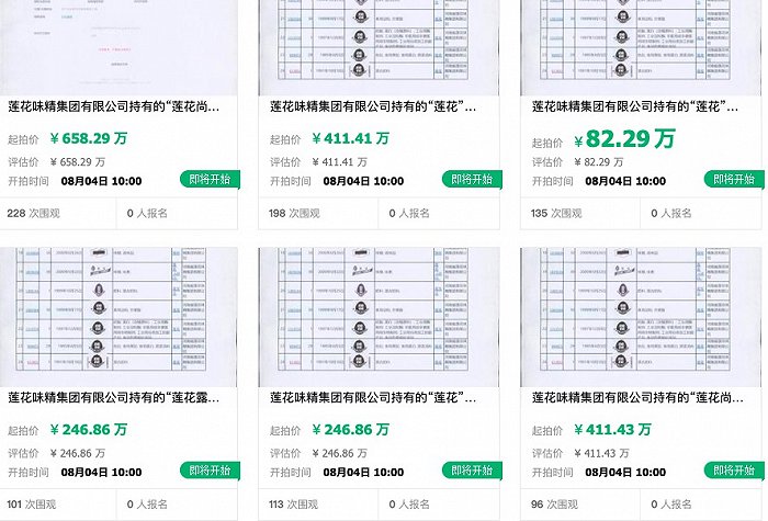 近日根据阿里拍卖显示,莲花味精集团持有的24枚“莲花”相关商标即将在8月4日进行公开拍卖,权利来源为司法裁定,拍品所有人为莲花味精集团有限公司。