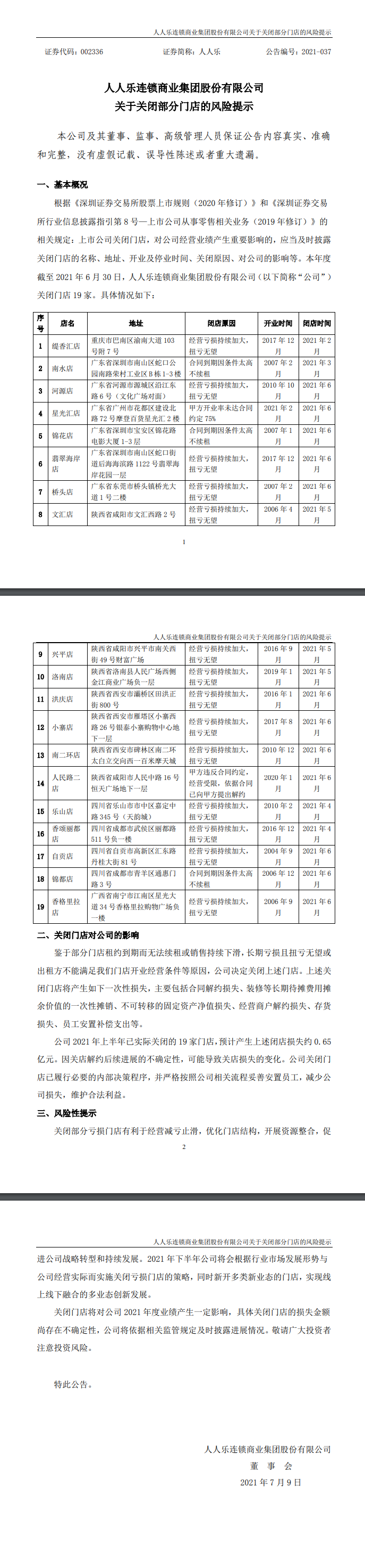 龙商网消息:7月8日晚间,人人乐发布公告称,鉴于部分门店租约到期而无法续租或销售持续下滑,长期亏损且扭亏无望或出租方不能满足门店开业经营条件等原因,本年度截至2021年6月30日,公司关闭门店19家。预计产生闭店损失约0.65亿元。