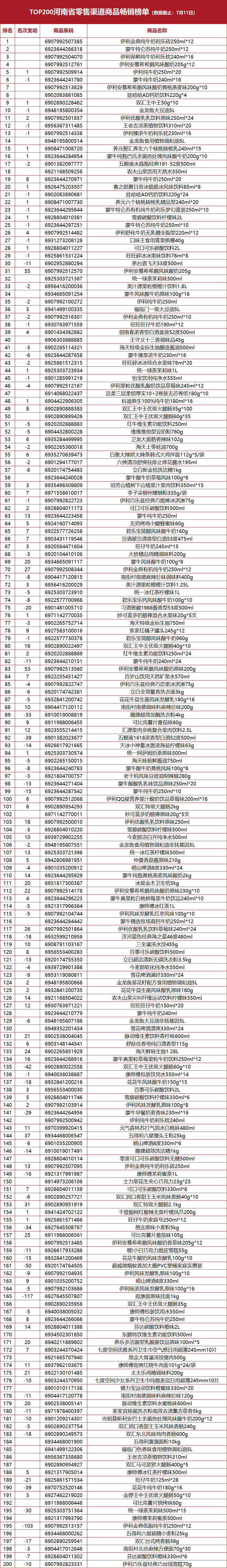 “TOP200河南省零售渠道商品畅销榜单”发布(7月4日版)