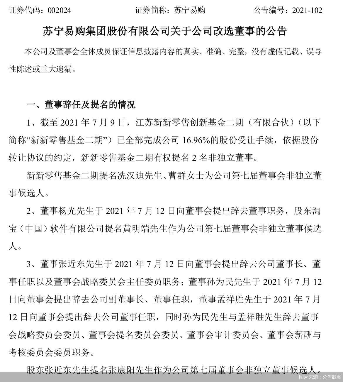 近几个月来,苏宁几乎一直负面缠身。资本运作稍作休整后,静待下一任掌舵人。7月12日,苏宁易购发布晚间公告,张近东辞任苏宁易购董事长,并被聘任为名誉董事长。另外,孙为民、孟祥胜、杨光已辞职。与此同时,公司董事会审议通过张康阳、黄明端、冼汉迪、曹群等人为公司第七届董事会非独立董事候选人。
