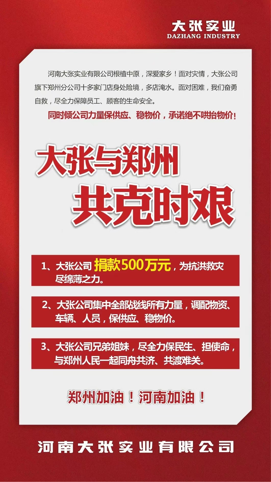 日前,河南大张实业有限公司宣布捐赠500万元用于抗洪救灾,并集中大张集团全部力量调配物资,保供应稳物价。