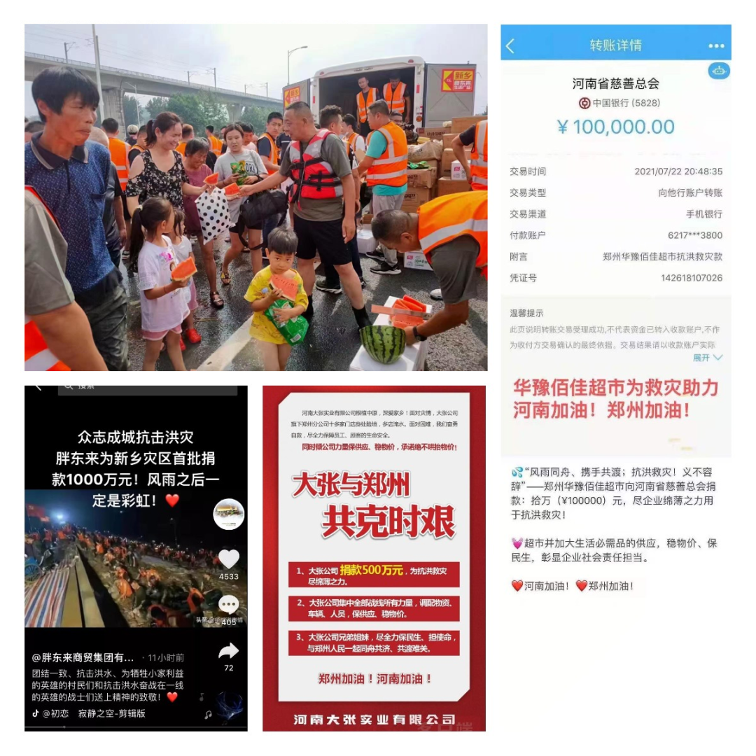 灾情出现的第一时间,以胖东来、大张集团、信阳西亚、南阳万德隆、新乡万德隆、万果园、丹尼斯、金好来、绿城超市、濮阳百姓等为代表的河南各地零售企业便迅速组织起来,以不同的形式驰援灾区、抗汛自救保供应。