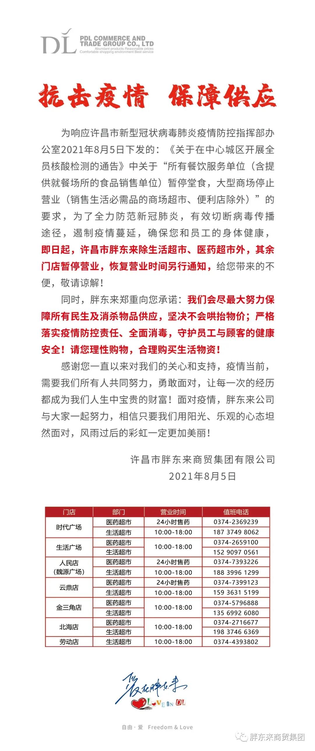 龙商网消息:8月5日,胖东来发布公告称,为响应政府疫情防控要求,即日(8月5日)起,许昌市胖东来除生活超市、医药超市外,其余门店暂停营业,恢复营业时间另行通知。