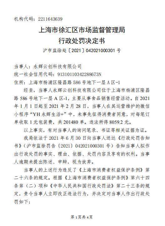 近日,上海市徐汇区市场监督管理局行政处罚书显示,永辉云创科技有限公司在其运营维护的微信小程序“YH 永辉生活+”中,事先未征得消费者同意,对每笔订单收取1元包装费,共201480单。违反了《上海市消费者权益保护条例》的相关规定,被没收和罚款3.2万余元。