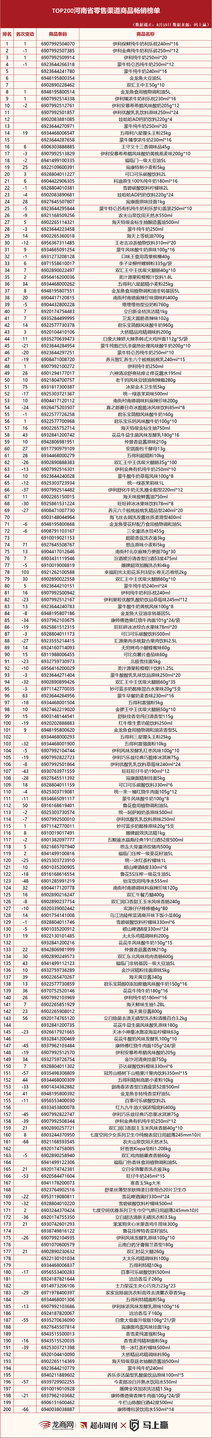 “TOP200河南省零售渠道商品畅销榜单”发布(7月4日版)