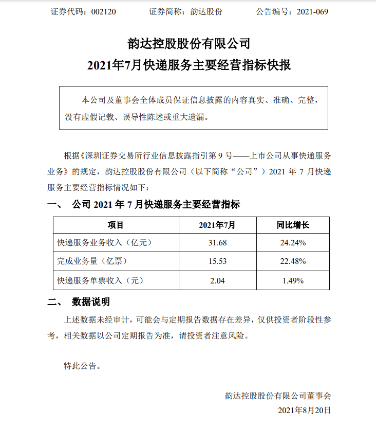 韵达股份公告,2021年7月快递服务业务收入31.68亿元,同比增长24.24%;完成业务量15.53亿票,同比增长22.48%; 快递服务单票收入2.04亿元,同比增长1.49%。...