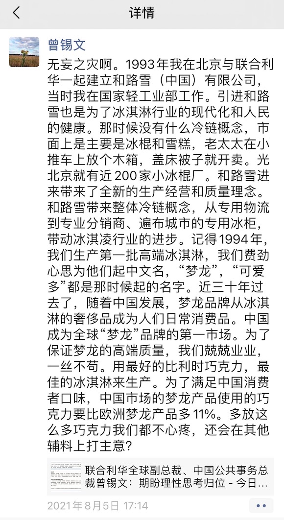 此前,面对梦龙中国采用跟国外不同原料真正目的在于节省成本的质疑,曾锡文曾在其微信朋友圈发文表示是“无妄之灾”,并声称,“为了保证梦龙的高端质量,我们兢兢业业,一丝不苟。用最好的比利时巧克力,最佳的冰淇淋来生产。为了满足中国消费者口味,中国市场的梦龙产品使用的巧克力要比欧洲梦龙产品多11%。多放这么多巧克力我们都不心疼,还会在其他辅料上打主意?”