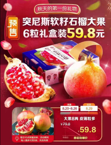 8月下旬起,家乐福重磅推出突尼斯软籽石榴礼盒,更有开学季活动,推出2粒装套装,满足学生等消费者尝鲜需求。若在预售期订购,6粒礼盒装价格更低至59.8元。此次活动将持续延续至中秋佳节。消费者可以从苏宁易购APP一级入口以及家乐福小程序购买,门店3公里内用户下单可享1小时极速送达。