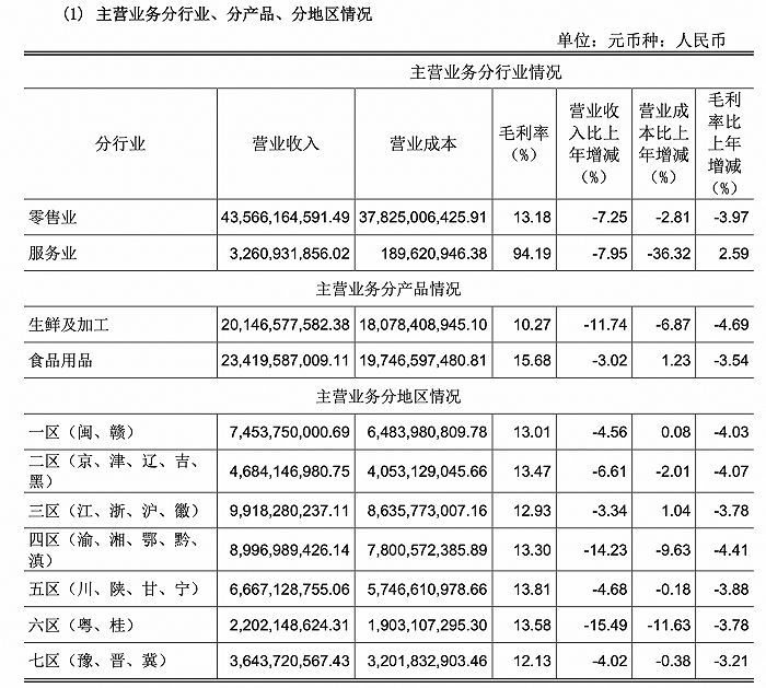 上半年,永辉的毛利率同样出现下滑,综合毛利率18.82%,同比下降3.55%;生鲜及加工毛利率10.27%,同比下降4.69%;食品用品毛利率15.68%,同比减少3.54%。