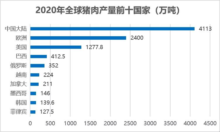中国是全球猪肉产量最多的国家,2020年猪肉产量达到4113万吨,其次是欧盟27国猪肉供应量为2400万吨,再次是美国猪肉供应量为1277万吨。