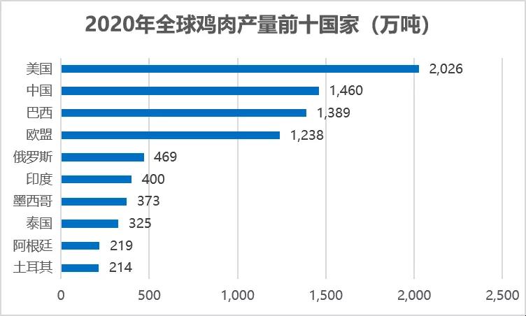 从地区分布上看,世界前三大鸡肉生产和消费国家为美国、中国和巴西。美国为世界鸡肉第一大生产国。中国在2019年超过巴西,成为世界第二大鸡肉生产国。