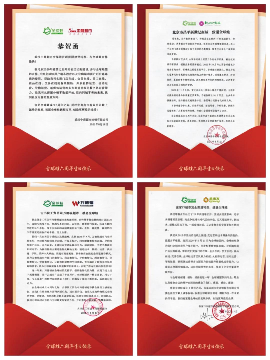 ▲全球蛙六周年部分商户贺信