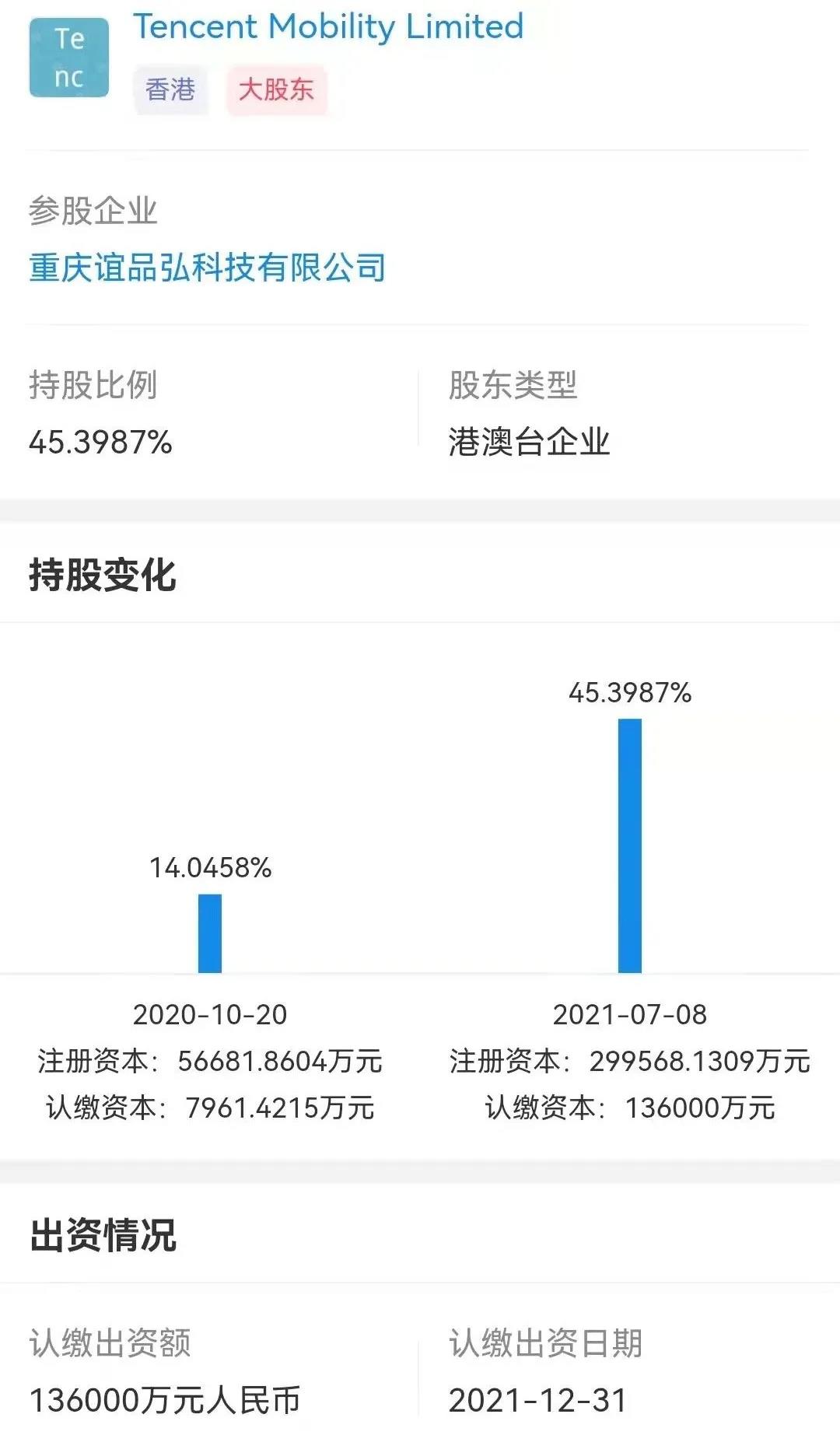 根据谊品生鲜所属公司--重庆谊品弘科技有限公司工商资料显示,在2021年7月,谊品生鲜扩大了一次注册资本,从5.67亿元大幅扩至29.96亿元。腾讯的认缴资本则从2020年10月的7961万元,增至13.6亿元。腾讯成为了谊品的最大股东,持股比例高达45.4%。