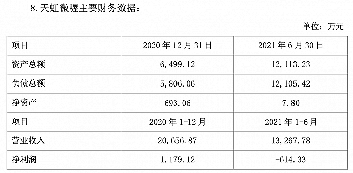 截至2021年6月30日,天虹微喔资产总额1.211亿元,负债总额1.2105亿元,净资产仅7.8万元。2021年上半年营业收入1.33亿元,同比下滑36%,净利润亏损614.33万元,与上年相比由盈转亏。
