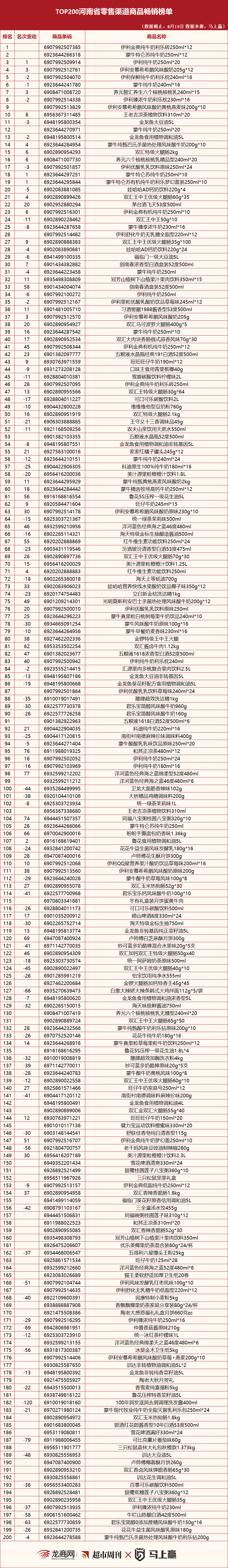 “TOP200河南省零售渠道商品畅销榜单”发布(8月29日版)