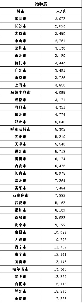 饱和度=该城市总人口数/该城市门店总量