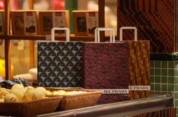 其中对于大家最有吸引力的是,每个摊位每日10:00-16:00限量提供PRADA印花包装袋,共有三款样式。