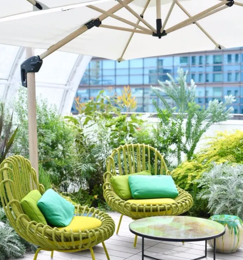 露天平台的设计极简却亮眼,蓝色渐变的编织椅和蓝色大理石桌面,很是抓人眼球,四周的绿化和泼墨装饰品。