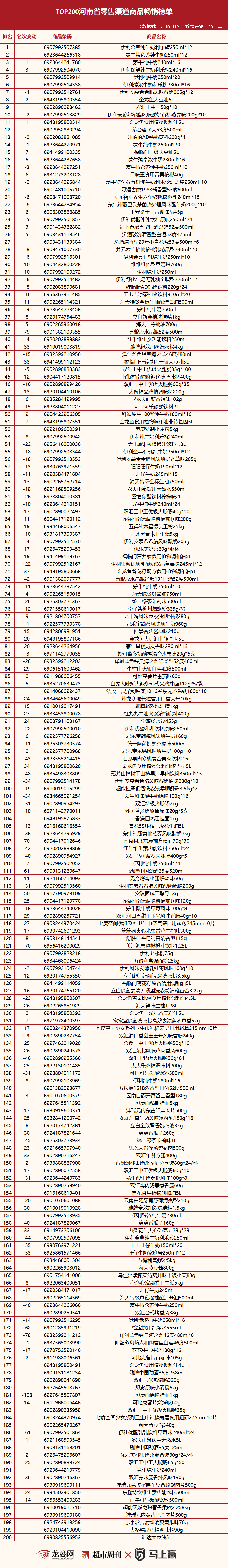 “TOP200河南省零售渠道商品畅销榜单”发布(10月10日版)