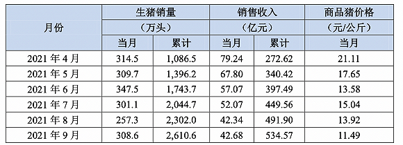 正邦科技的9月份生猪销售情况简报也显示,2021年1-9月,公司累计销售生猪1183.5万头,同比增长99.76%,尤其是5-9月,月均销售头数高于1-4月,意味着其仍然在释放生猪产能。牧原股份同样如此,其生猪销售情况简报显示,牧原股份在4-9月的月销售头数均超过300万头,而去年的水平在200万头以下。