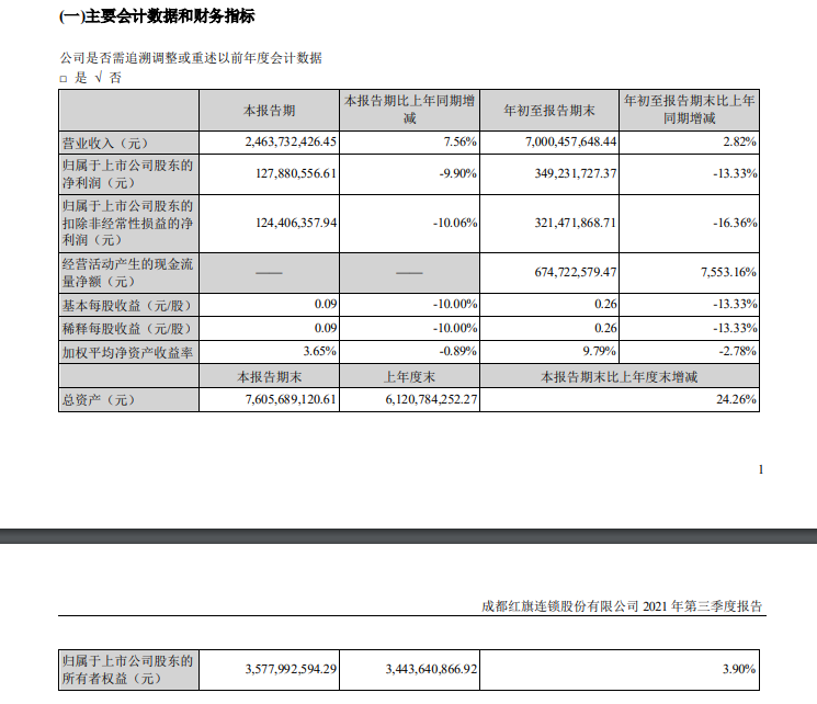 龙商网消息:红旗连锁发布2021年第三季度报告。报告显示,前三季度营收70亿元,同比增长2.82%,其中第三季度营收24.64亿元,同比增长7.56%。前三季度归母净利润3.49亿元,按财政部修订后的《企业会计准则第21号-租赁》执行实施后,对当期净利润有所影响,导致同比下降13.33%;如扣除准则影响后,净利润同比仅下降0.73%。