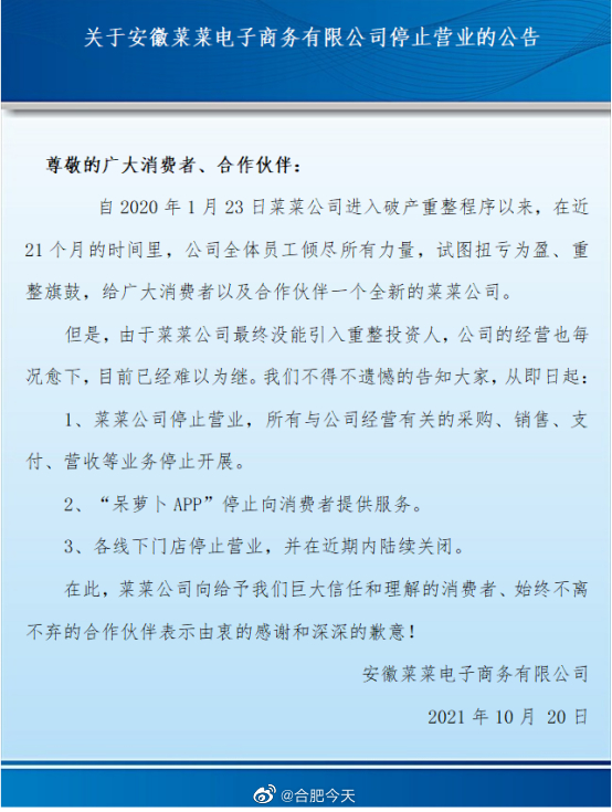 菜菜公司停止营业,所有与公司经营有关的采购、销售、支付、营收等业务停止开展。“呆萝卜APP”停止向消费者提供服务。各线下门店停止营业,并在近期内陆续关闭。