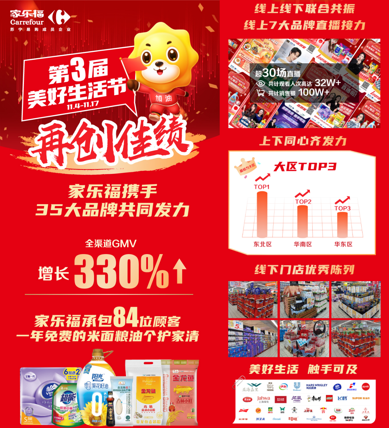 洞察消费需求,双11期间家乐福推出了第三届美好生活节。联合35大品牌,提供多场形式丰富、折扣力度大的活动,全方位承包消费者一年的美好生活。数据显示,11月4日至11月17日,家乐福再创佳绩,全渠道GMV增长330%。线上线下齐共振,联合7大品牌方直播超30场,持续不断为消费者打造身边“触手”可及的美好生活。