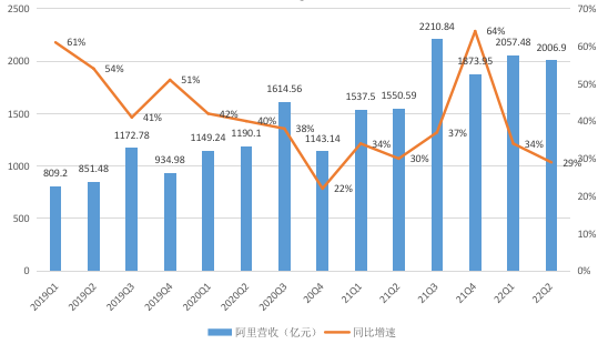 电商起家,20多年逐渐成长为现在的阿里数字经济体,从云计算、大文娱再到本地生活,阿里已经不再是传统的电商平台。数据显示,第二财季,阿里巴巴营收2006.9亿元,同比增加29%。值得注意的是,从2021财年开始,阿里的营收增速就一直保持在30%以上,而本财季的数据也是近6个季度以来的新低。