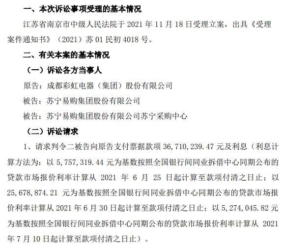 据介绍,彩虹集团与被告苏宁采购中心以其苏宁易购天猫及加盟店、苏宁对公、苏宁自营(常规门店、直营店、电器超市)等渠道开展线上和线下业务合作,销售公司生产的生活电器产品,双方订立了业务合作合同,合同约定货款结算周期为1个月,货款支付方式为三个月电子银行承兑汇票。后在合同履行过程中,苏宁采购中心违反合同约定,出现逾期支付货款的情形。在不得已的情况下,公司接受了商业承兑汇票支付方式。2021 年 3 月 19 日至 2021 年 4 月 13 日期间,出票人苏宁采购中心以公司为收款人,开具了电子商业承兑汇票 4 张,票据金额分别为5,757,319.44 元、13,605,275.12 元、12,073,599.09 元、5,274,045.82 元,4张汇票均经苏宁采购中心承兑,到期无条件付款。上述电子商业承兑汇票合计金额为 3671万 元,上述汇票现已到期。公司通过在电子汇票系统提示付款、发函通知、派员催收等多种方式要求苏宁采购中心付款,但苏宁采购中心始终拒绝支付。