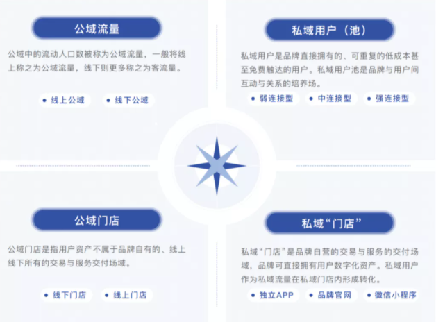 在这个关键窗口期,如果不厘清相关概念及其价值,品牌商家将难以明确投入重点,进而建立和不断完善全域经营体系,促进生意的可持续增长。为此,《指引》对公私域全局发展进行了系统化梳理,首次对“公域流量”“私域用户池”“公域门店”“私域门店”等核心概念的内涵、外延及价值作了明确定义。