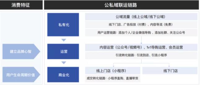 尽管零售业不同细分领域的特性和经营模式差异显著,但公私域联运的核心链路基本涵盖三个关键步骤——公域流量的私有化沉淀、私域用户池的运营和私域的商业化实现。