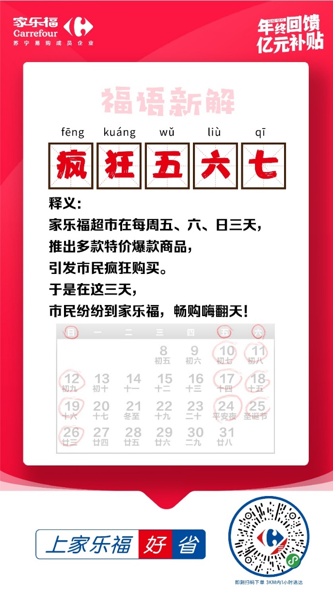 时近年末,正是一年消费旺季。为了满足广大顾客的消费需求,12月起,家乐福推出疯狂五六七活动,回馈补贴消费者,为消费者打造触手可及的品质好省生活。 (图:家乐福疯狂五六七福语新解 每周五六日畅购嗨翻天) 作为家乐福消费者回馈的重要举措,12月起,每...