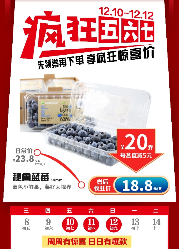 作为世界粮农组织推荐的五大健康水果之一,蓝莓营养丰富,富含花青素。本周家乐福推出250g盒装的秘鲁蓝莓,依托家乐福的全球供应链体系,从秘鲁产地直采,跨越千山万水,来到中国消费者的餐桌。14mm+的成熟蓝莓果实果型饱满,覆盖着均匀的白霜,尝一口,入口是清新适口的酸甜,新鲜的果肉柔软细腻。“疯狂五六七”活动期间领券每盒立减5元,最高可减20元。