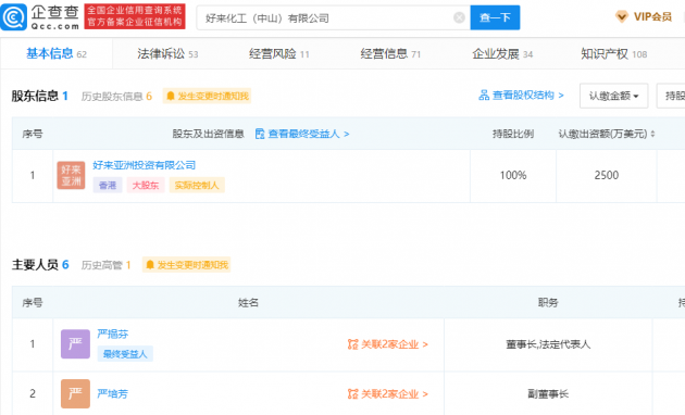 企查查APP显示,黑人牙膏关联企业为好来化工(中山)有限公司,该公司成立于1995年7月,注册资本2500万美元,由好来亚洲投资有限公司全资持股。