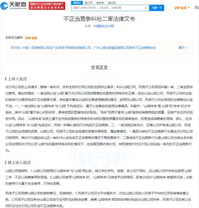 龙商网消息:据中国裁判文书网,12月15日,沃尔玛(中国)投资有限公司、广东山姆冷链食品有限公司等不正当竞争纠纷民事二审判决书公布。