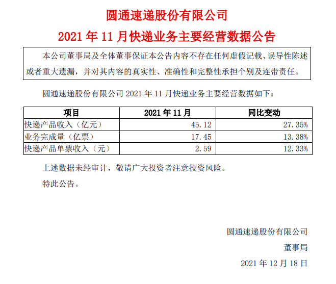 圆通速递:11月快递产品收入同比增长13.64%