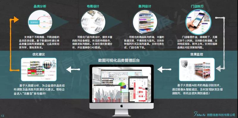 数图可视化品类空间管理解决方案,是数图信息科技跟进国内外精细化管理经验,结合大数据、可视化技术研发的,适合国内连锁零售企业的可视化品类空间管理解决方案。帮助连锁零售企业实现从品类结构优化到品类在门店、区域、货架的具体落位。从过去看“坪效”、“人效”的“看大数”的粗放式管理方式,到能够看到门店“每一厘米”经营效率的精细化管理方式的转变。