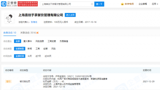 龙商网消息:12月30日,企查查APP显示,近日,喜茶关联公司上海喜创于茶餐饮管理有限公司新增行政处罚。