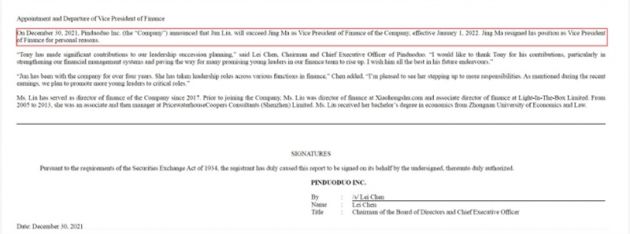 龙商网消息:日前,根据拼多多提交了最新的SEC文件显示,该公司财务副总裁马靖因个人原因离职,其职位将由刘珺接任。这也是拼多多在过去三年来第二次财务副总裁人员变动。