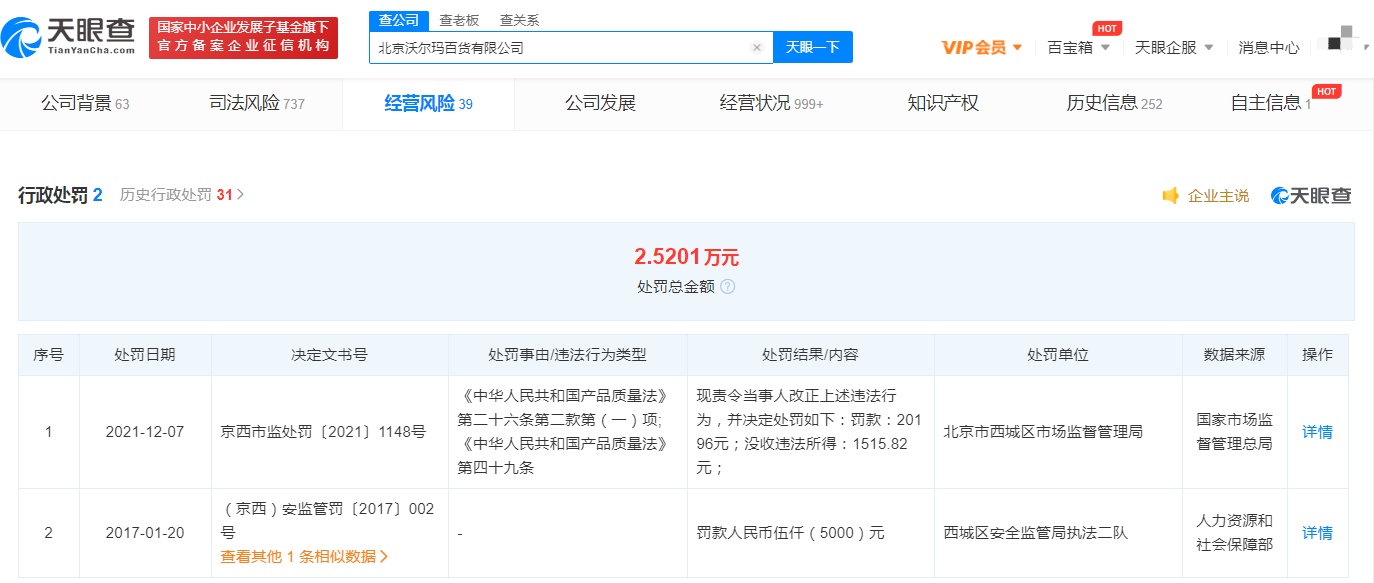 龙商网消息:天眼查信息显示,近日,北京沃尔玛百货有限公司新增一则行政处罚,处罚原因为违反产品质量法,决定文书号京西市监处罚〔2021〕1148号,处罚结果是罚款20196元、没收违法所得1515.82元。处罚单位是北京市西城区市场监督管理局。