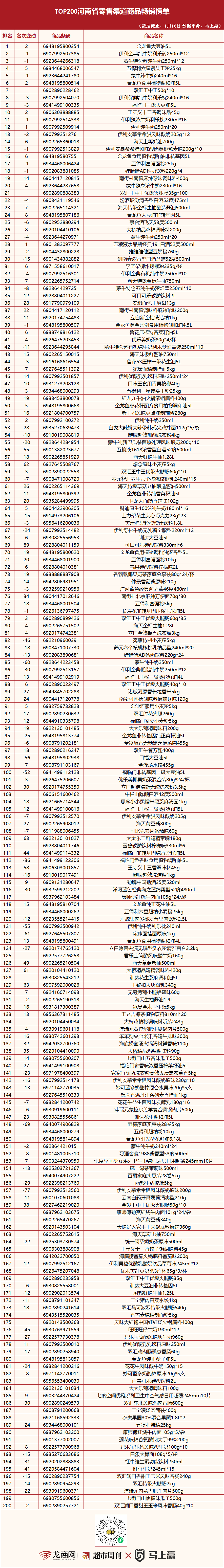 “TOP200河南省零售渠道商品畅销榜单”发布(1月2日版)