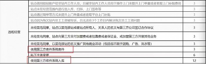 《菜鸟驿站合作协议》显示,使用第三方系统寄件及入库都属于违规经营。